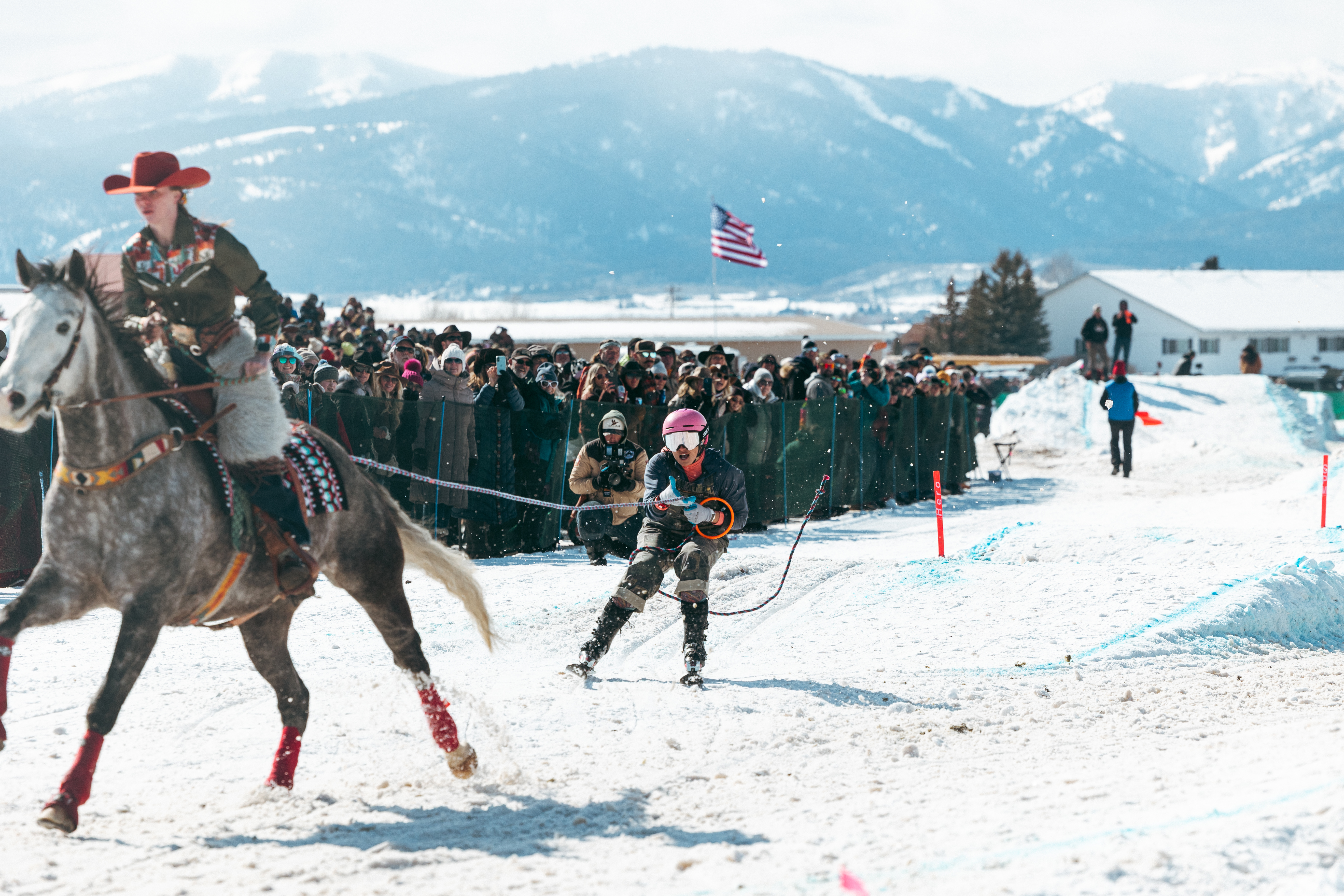 Skijoring has roots in Scandinavia, where skis were once used behind horses for winter travel. In the American West, it has evolved into a high-speed competition. The simplest way to describe it: waterskiing, but on snow and behind a horse.